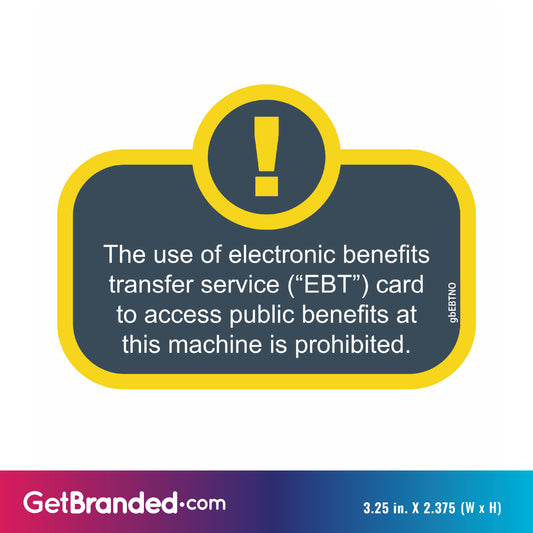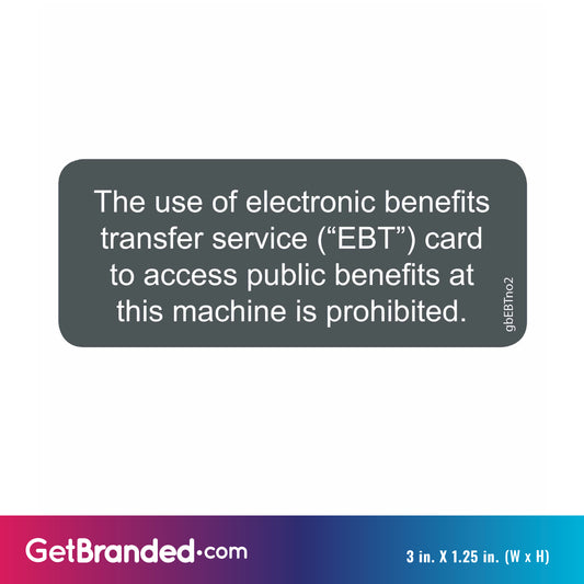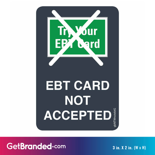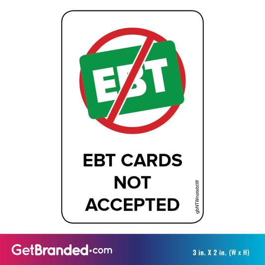 Merchants that accept the U.S. Department of Agriculture's (USDA) Supplemental Nutrition Assistance Program (SNAP) food and nutrition benefit, formerly known as food stamps, and electronic payments through EBT can utilize SNAP and EBT decals for awareness and instructions. EBT Accepted Here and Try Your EBT Card are popular decal designs for convenience and grocery stores, farmers' markets, and food co-ops as a friendly and discreet way to let customers know they can swipe their EBT card at checkout. Similarly, retailers that do not accept SNAP for revenue generation need EBT Cards Not Accepted and Use of Electronic Benefits Transfer Service ("EBT") Card is Prohibited at This Machine decals. Our decals adhere easily to windows, doors, counters, credit card processing terminals, cash registers and other point-of-sale surfaces.
