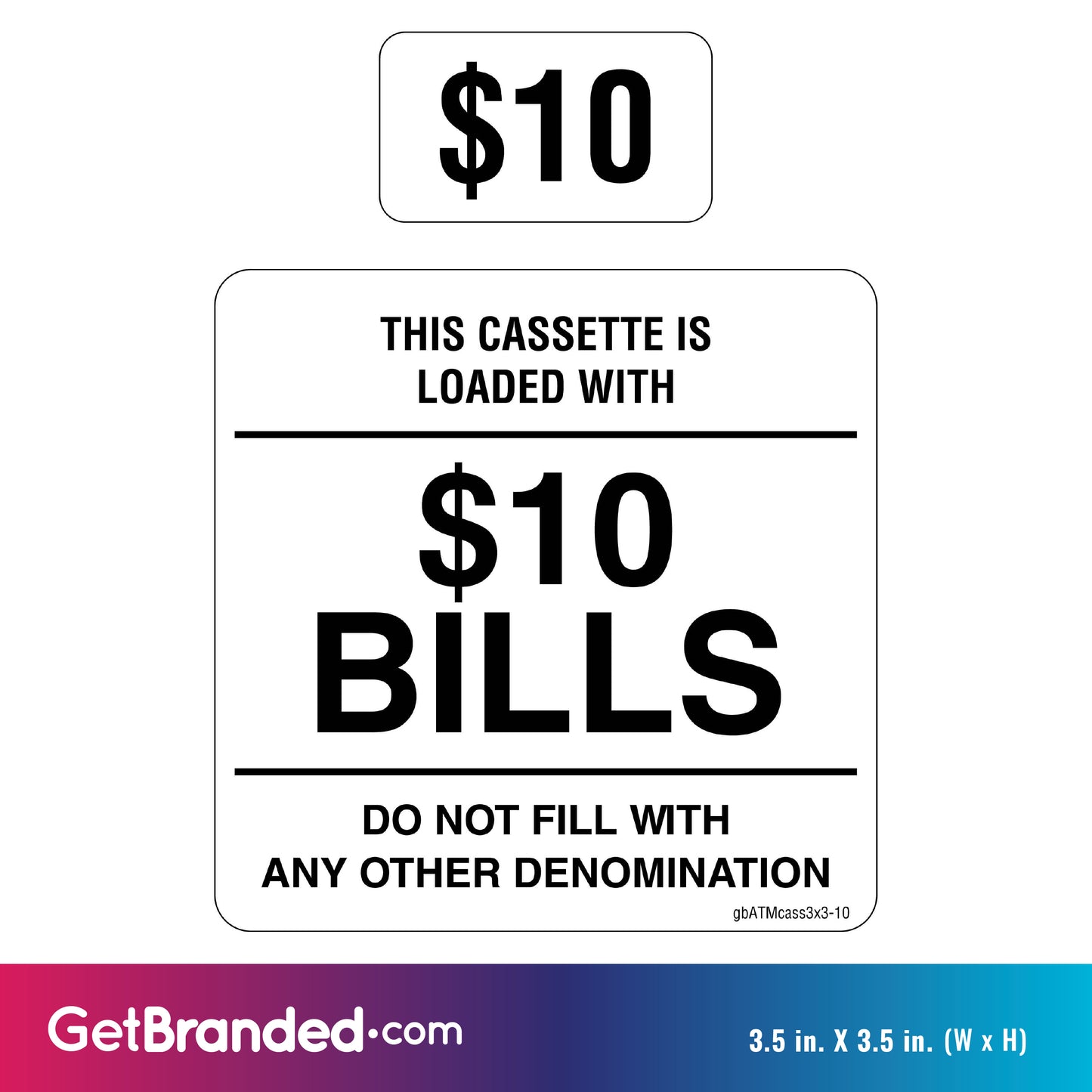 3.5" x 3.5" Cassette Loaded with $10 Bills Decal. It is printed on durable SharkSkin® material that is scratch-resistant, UV-protected, and easy to apply. This decal is perfect for ATMs, banks, and credit unions.